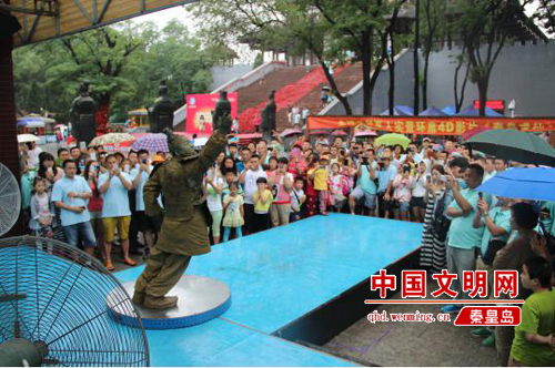 2016年7月7日,記者來(lái)到秦皇求仙入海處。在求仙殿廣場(chǎng)的東南方舞臺(tái),伴著富有節(jié)奏感的音樂(lè)響起,“泡泡大叔”的街舞表演準(zhǔn)時(shí)開(kāi)始。他穿著皮質(zhì)的兵馬俑服裝,蹬著黑色軍靴,臉上涂滿灰色油彩。只見(jiàn)他雙腳不動(dòng),雙手舞動(dòng)前伸,身體前傾與地面成45度。固定幾十秒后,身體慢慢復(fù)位站直,又隨著音樂(lè)跳起了街舞。大約半個(gè)小時(shí)后,汗如雨下的“泡泡大叔”沖到電扇前吹風(fēng),一口氣喝下2瓶藿香正氣水,又跑回舞臺(tái)繼續(xù)表演。